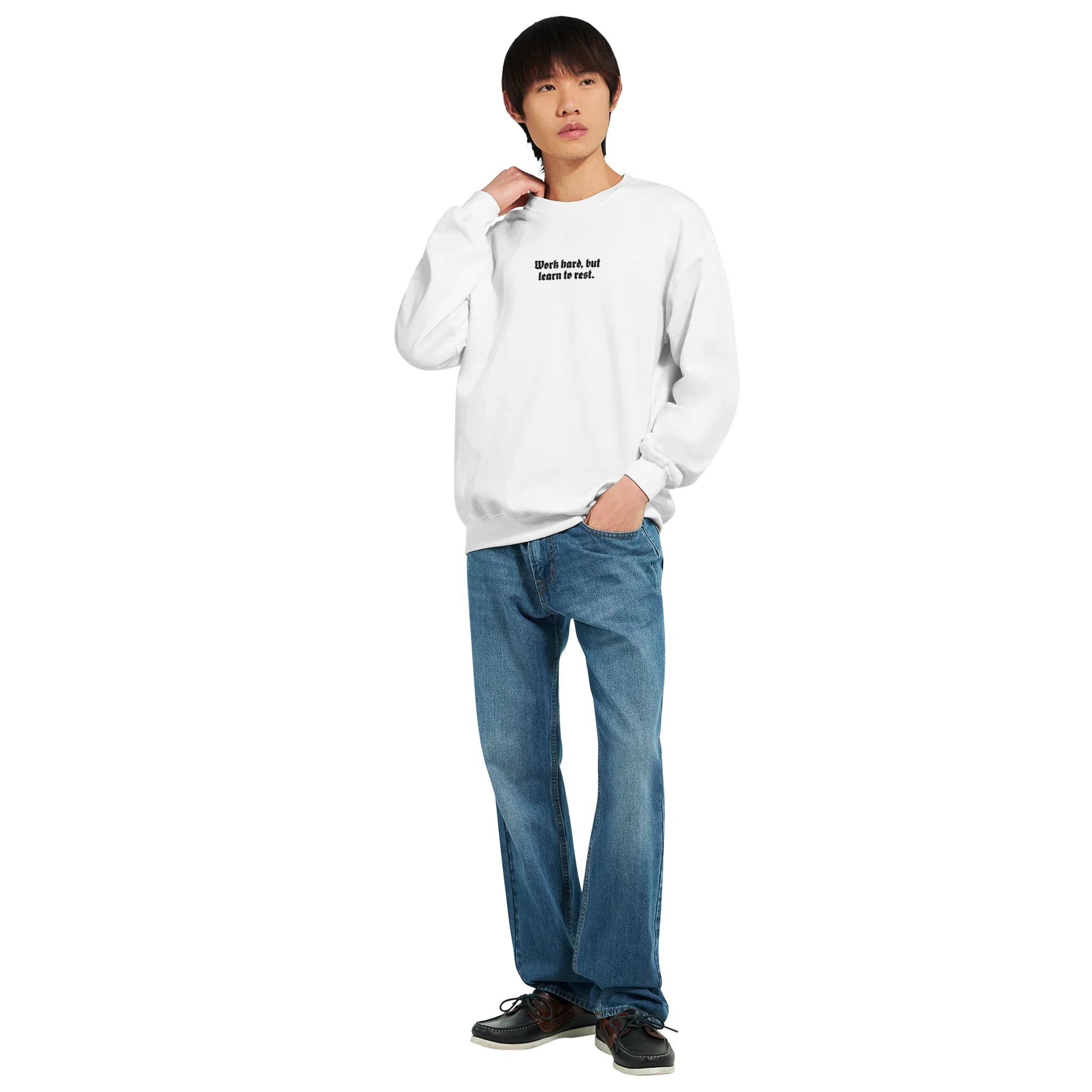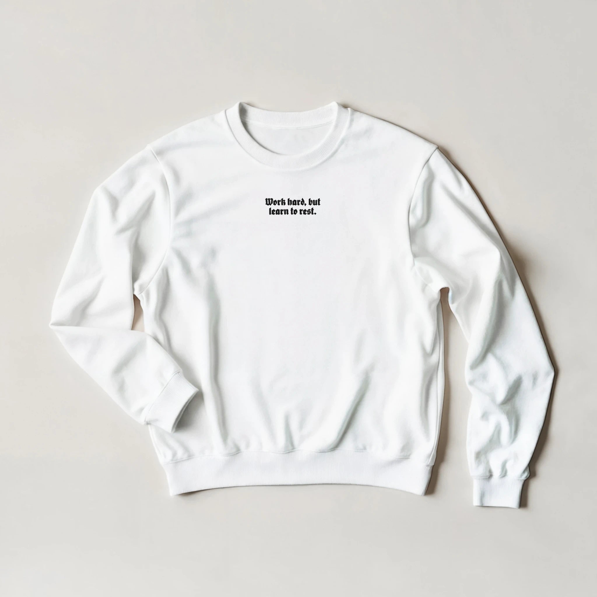 Work hard, but learn to rest BOLD – Statement Sweater – Minimal Text. Maximum Attitude. | Unisex Crewneck Sweatshirt (Gildan® 18000)